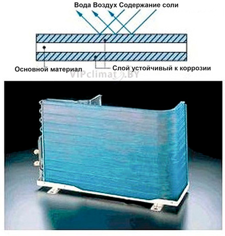 Специальное антикоррозийное покрытие теплообменника, защищающее от атмосферных явлений и воздействий агрессивной внешней среды. В то же время, благодаря технологии Blue Fin, улучшается теплообмен, что приводит к увеличению производительности кондиционера. Ускоряет процесс размораживания и повышает эффективность обогрева, значительно снижая энергозатраты.