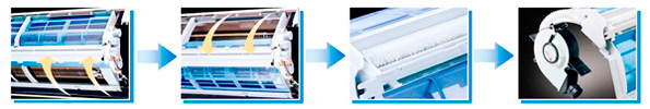 - Блок работает в режиме охлаждения при низкой скорости вращения вентилятора. Образовавшаяся вода убирает пыль с испарителя.