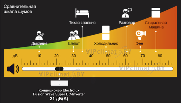При покупке сплит-системы на уровень шума следует обращать отдельное внимание, особенно, если она будет установлена в тихой спальне. Например, кондиционеры Electrolux Fusion Wave Super DC-Inverter EACS/I-09HFW/N8 (для помещений до 26 м2) имеют уровень шума 21 дБ(А) при низкой скорости вращения вентилятора внутреннего блока (бесшумный режим). Данный показатель практически неразличим для человеческого уха. Для сравнения, тихий разговор имеет громкость в 25-30 дБ(А), а звуки менее 21 дБ(А) сложно услышать.