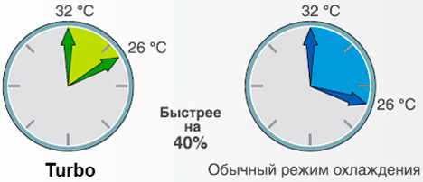 Позволяет быстро создать комфортные условия, даже когда температура в комнате далека от идеальной. При нажатии кнопки «Turbo» на пульте ДУ вентилятор внутреннего блока начинает работать на сверхвысокой скорости, охлаждая или нагревая воздух с повышенной интенсивностью. После достижения заданной температуры сплит-система автоматически переходит в обычный режим работы.