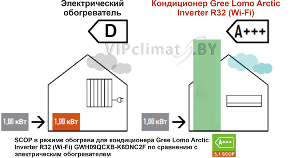 Эксплуатировать кондиционер для обогрева помещения зимой очень удобно и экономически выгодно (высокий КПД). Кондиционер, работающий на обогрев - это тот же тепловой насос “воздух-воздух”. Данная сплит-система выдает тепловой энергии намного больше, чем потребляет электричества. Например, кондиционер Gree cерии Lomo Arctic Inverter R32 (Wi-Fi) GWH09QCXB-K6DNC2F (для помещений до 30м2) с 1 киловатта электричества выдает до 4,25 кВт тепла (высокий КПД, эффективность 420%). В то же время обычный электрический прибор (масляный радиатор) потребляет 1 кВт электроэнергии, а выдает в виде тепла всего 0,9-0,95 кВт (очень низкий КПД, эффективность 90-95%). Таким образом, при использовании кондиционера Gree cерии Lomo Arctic Inverter R32 (Wi-Fi) стоимость энергопотребления для обогрева помещения уменьшается в 4-5 раз. Делаем вывод, что обогрев сплит-системой в несколько раз экономически выгоднее, чем использование традиционных электронагревателей.