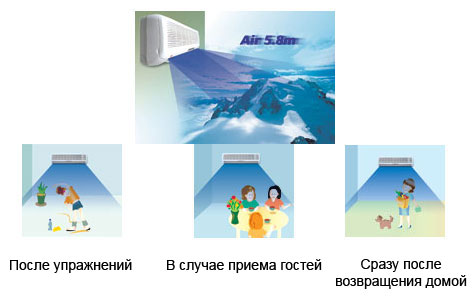 Функция быстрого охлаждения предназначена для быстрого охлаждения воздуха в комнате. В этом режиме сильный поток холодного воздуха подается с высокой скоростью в течении 30 минут, пока температура в комнате не достигнет 18С.