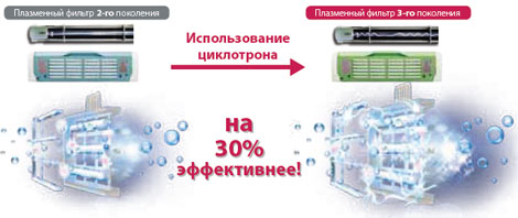 Разработанная компанией LG Electronics система очистки воздуха Plasma снижает количество мельчайших загрязняющих частиц и пыли, а также удаляет бытовых клещей, пыльцу растений и шерсть животных, предотвращая аллергические заболевания и приступы астмы. Плазменный фильтр третьего поколения, который является новинкой, по своей эффективности превосходит фильтры второго поколения на 30% благодаря совместному использованию электрического и магнитного полей.
