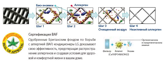 Благодаря революционному антиаллергенному и антивирусному фильтру новые кондиционеры LG улавливают аллергены и вредоносные вирусы, передающиеся воздушно-капельным путем. Фильтр состоит из органических и неорганических звеньев, связывающих основу с нанесенными на нее энзимами, поглощающими аллергены. Когда воздух проходит через фильтр, аллергены задерживаются на фильтре и деактивируются энзимами.