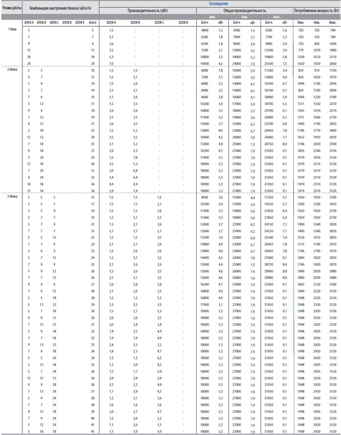 Таблица комбинаций внутренних блоков в системе MU4M27